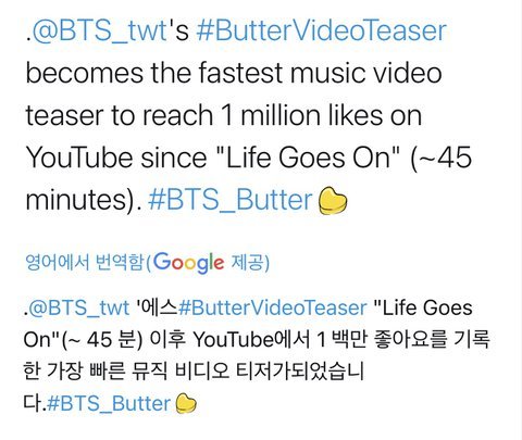 저건 티저끼리 기록인데 참고로 유튜브 전체 영상 중 좋아요 100만을 가장 빨리 받은 영상은 다이너마이트 뮤비임 무려 -2분임... 2분 아니고 마이너스 2분... 최초공개대기시간 중에 찍음