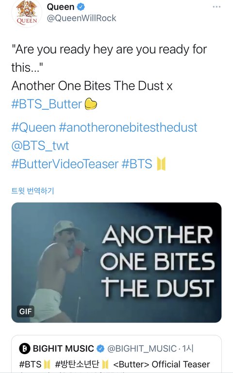 퀸 오피셜 계정인데 방탄 티저 영상 올린 게시물 공유했음