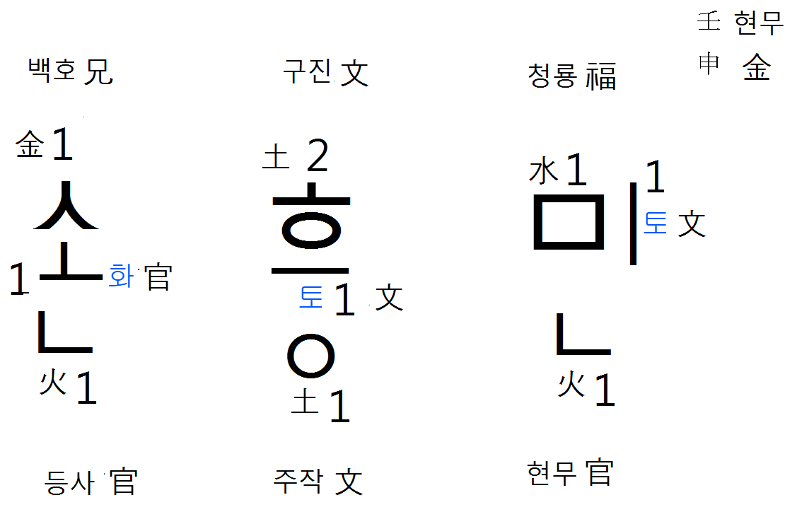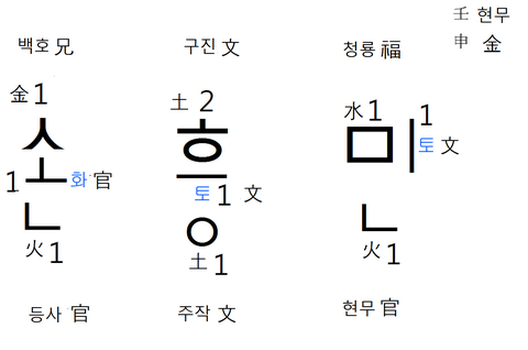 말자(末字)를 본다면 청룡(靑龍)재주가 현무(玄武)관귀(官鬼)를 수극화(水剋火)로 누르며 상관(傷官)패인(佩印)하는 청룡 문(文)의 영양분이 되는 거다 그러니깐 재능(才能)을 갈고 닦게 하는 학원 집단 역시 청룡이라 하는 길신(吉神)이라는 건데 거기 음흉(陰凶)한 현무(玄武)가 들어 붙으려 하는건데 내려 긋는 기둥이 발음은 상하(上下)상통할 ‘신’자(字)이기도 하지만 미끄러워선 붙들고 턱걸이 하기 어려운 것 ‘니은’ 종성(縱聲) 발음 누운 갈고리 살 현무(玄武)가 관귀(官鬼)병귀(病鬼)가 메달리기가 어렵다는 거지...