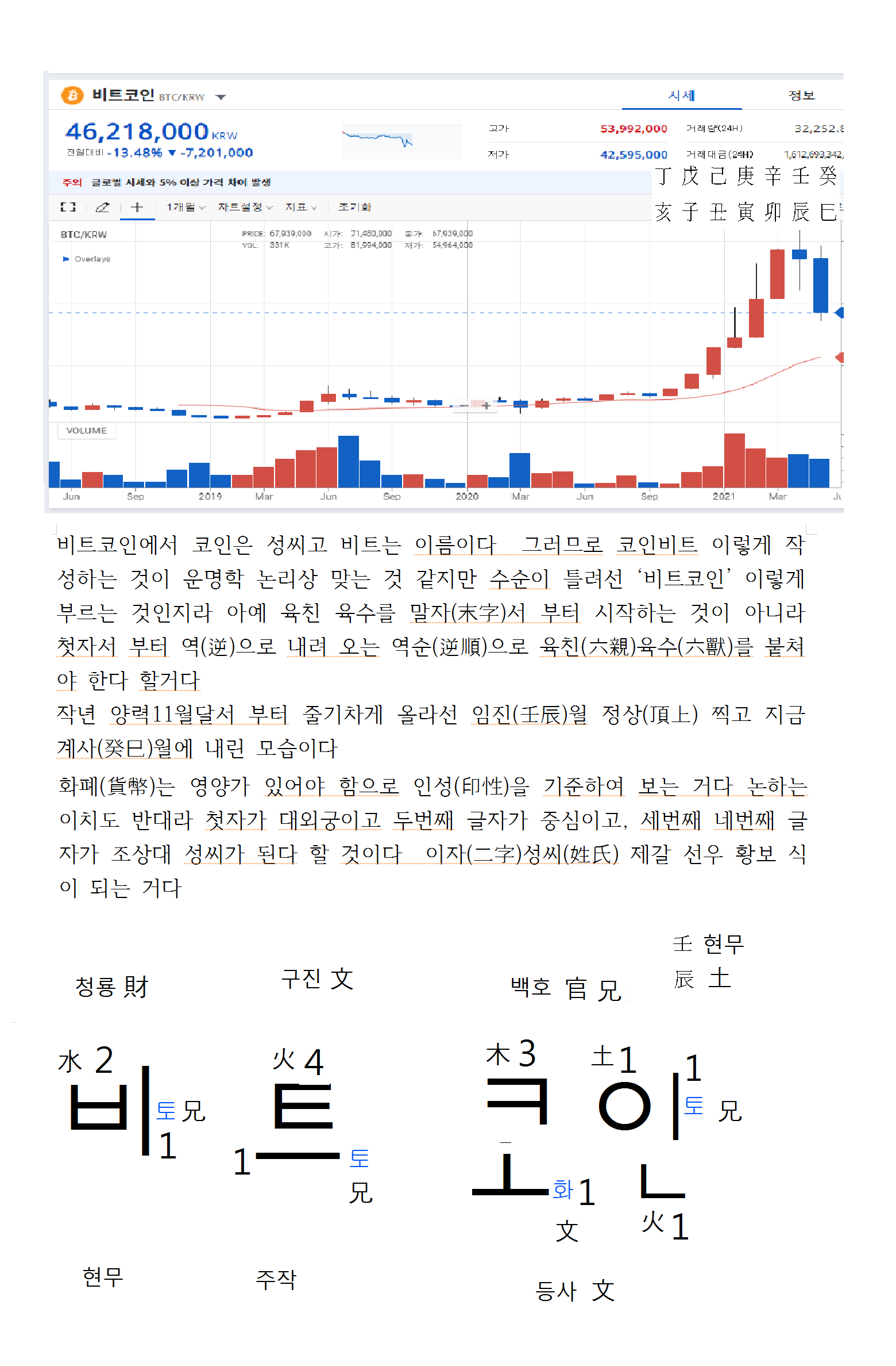 비트코인에서 코인은 성씨고 비트는 이름이다 그러므로 코인비트 이렇게 작성하는 것이 운명학 논리상 맞는 것 같지만 수순이 틀려선 ‘비트코인’ 이렇게 부르는 것인지라 아예 육친(六親) 육수(六獸)를 말자(末字)서 부터 시작하는 것이 아니라 첫자서 부터 역(逆)으로 내려 오는 역순(逆順)으로 육친(六親)육수(六獸)를 붙쳐야 한다 할거다