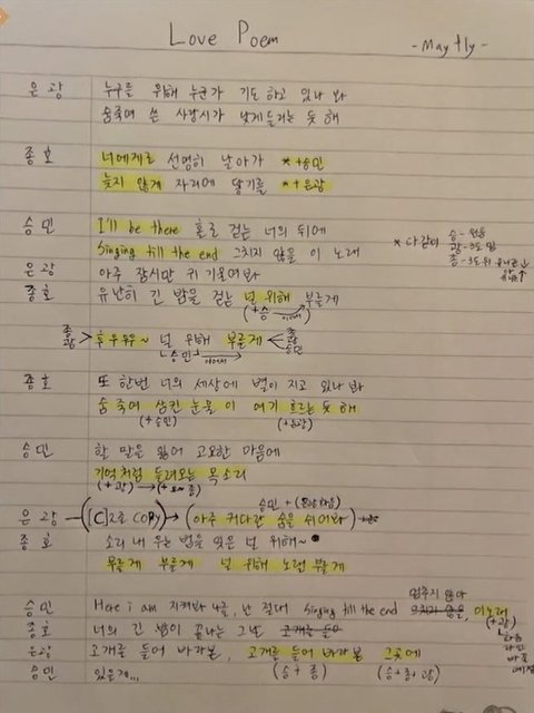 아니 어떻게 저걸 그냥 앉아서 분배한거지 목소리 대충 알고있다지만 진짜 신기함 특히 화음 어디들어가면 좋을지 생각해낸게 형광펜부분이 화음같은데 보컬천재냐고,,