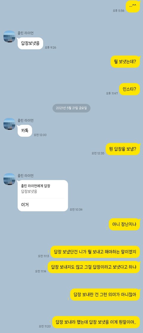 아니 이게 상식적으로 말이 되는거임? 답장 보내랬는데 답장 보냇음… 와 그래서 난 카톡 말고 인스타나 딴데로 보낸줄… 나만 이해 안되는건가 진짜 이렇게 답이없는 애는 처음인데 우짜지