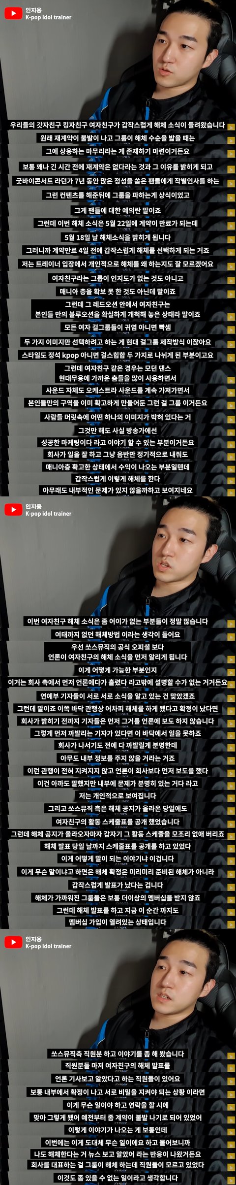 이번 해체는 역사상 엄청 찝찝하고 화나는 해체다... 이유도 안 알려줘, 직원이 몇명있다고 직원도 몰라 직원들 대부분 퇴사해서 얼마 있지도 않을텐데... 몰랐으니 스케줄 다 진행하고 전날까지 영상 올려줬겠지. . 그 직원들도 당황했겠다...