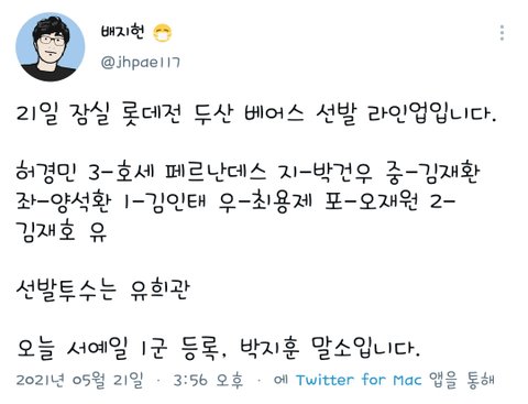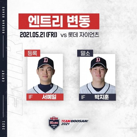 5. 21 두산 베어스 엔트리 변동 + 라인업