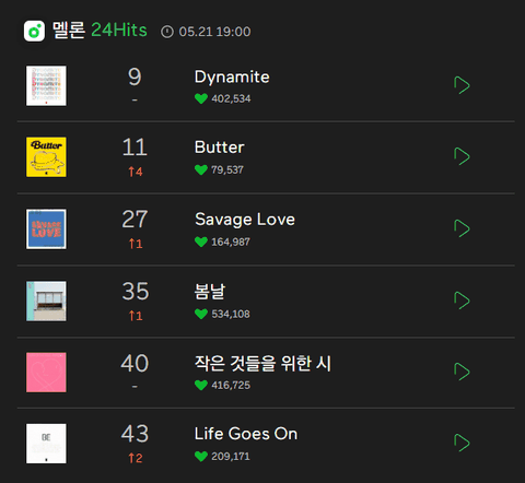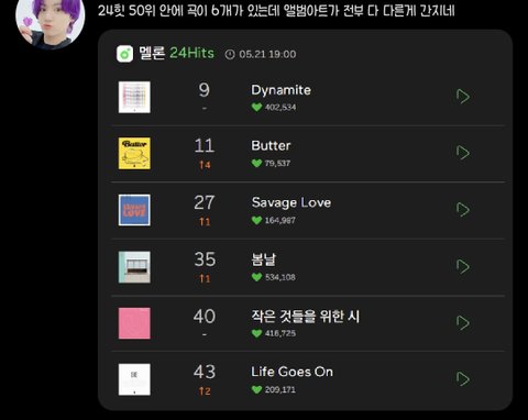 참나..방탄 신곡 나왔다고 스밍 몇 시간 돌렸는데 실시간 차트도 아니고 24힛 순위가 바뀌네?그것도 한곡이 아닌 여러곡이 바뀐다고?참나..어이가 없네ㅋㅋㅋ결론은 너네 팬덤 단합력 무섭고 좀 부럽다ㅠㅠ