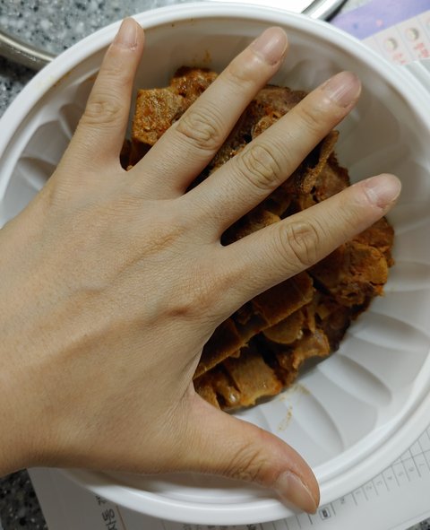 사진은 쫙피면 한뼘 20센티 나오는 여자손이며 대사이즈 포장용기와 뼈추가 포장용기 비교샷입니다.