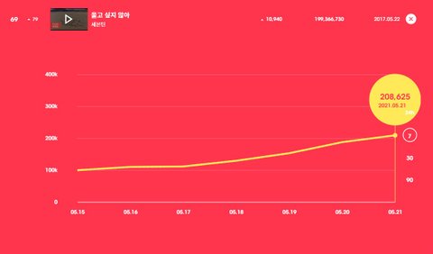 2021. 05. 22 12 : 00 기준 울고싶지않아 뮤비 조회수 : 199,366,730회