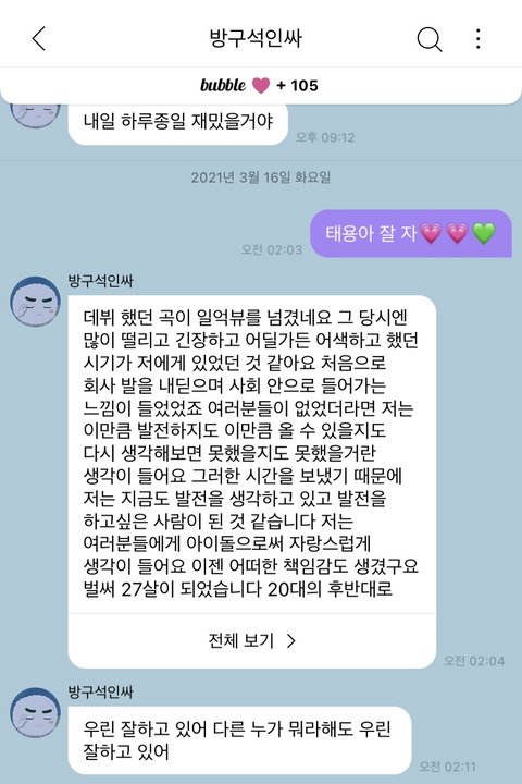 원래 새벽에 보내고 그런거 안하고 그냥 오면 답장하는 스타일인데 저 날따라 그냥 자기 전에 보내고 싶었음... 그래서 보냈는데 보내자마자 태용이한테 장문 편지와서 ㄹㅇ 울컥했음