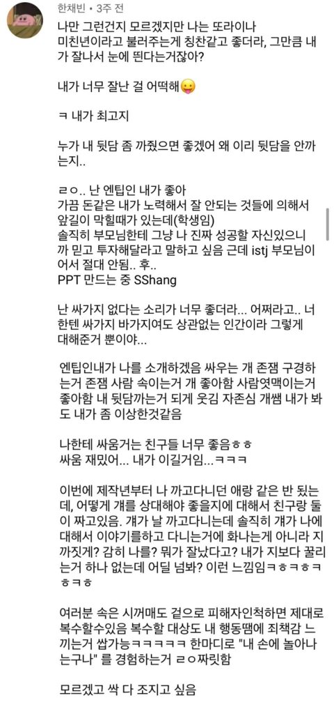 내가 멍청이도 아니고 일커질까봐 일부러 얘기 안하고 약속 지킨거고 자랑거리도 아니기에 그냥 별말 안한건데 쟤는 나랑 연락한게 자기 업적인것 마냥, 자기가 모든 사람들을 조종하고 휘어잡고 있다는거 마냥 뒤에서 얘기하고 다님 ㅠㅠ