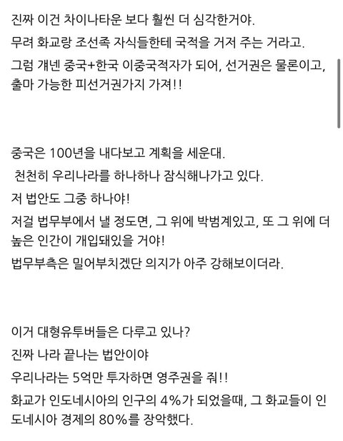 우리나라 지금 중국한테 먹히고 있어. 역대급으로 심각한데 관심 가져주라.. 정부가 중국인 한국에 편입시키려고 국적 주겠대. 매년 외국인 약 700명이 한국인 되는데 대부분이 중국인이야. 또 공산당이 전국적으로 사업을 조성하면서 각 지역들이 잠식당하고 있어. 이게 우연일까? 묻히면 결국 못 막고 하나의 중국 되는거 시간 문제야.. 진짜 실검도 없고 언론통제도 심한데 ㅠㅠ 지나치지 말고 제발 화력 보태주면 좋겠어