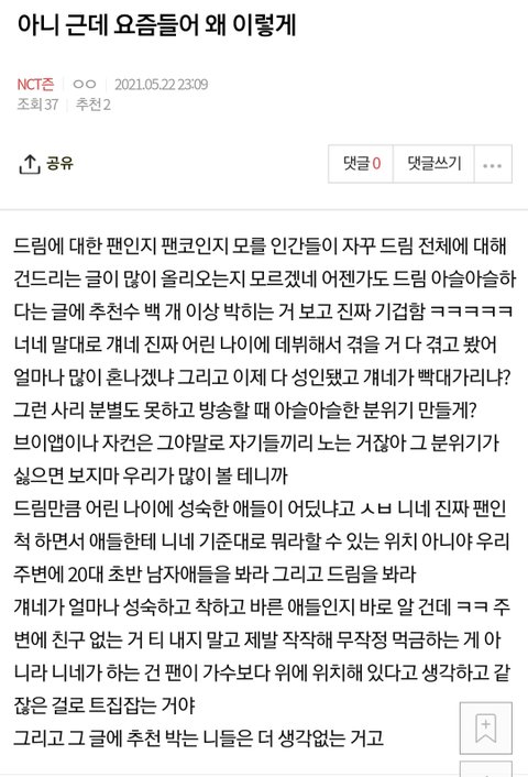 팬들 중에 몇 명은 드링깅들이 진짜 온실 속 순수하게 자란 애들인줄 아는데 그것도 애들에 대한 잘못된 환상 만드는거임 이십대들이 다른 이십대들이랑 같겠지...제발 신격화 좀 하지마 애들 피곤하게 하는거임 그거 자체가