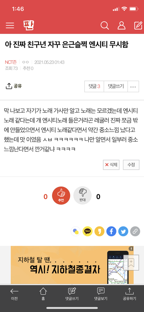 진짜 애 트위터나 판에서 잼민이들이 쓴거 대충봐서 나한테 막 재현이랑 ㄹㄷ랑 사귄다하고 증거 있냐고 물어보니까 뭐 어디 음악방송에서 둘이 눈마주치고 웃은게 증거래 ㅋㅋㅋㅋㅋ아니 어이없서서 쳐보니까 막 다 아니라는 반응 많으니까 당황해서 갑자기 말바꿈 막 근데 눈마주치고 웃는것만 보고 열애설이라고 하는건 좀 그렇다고 이지랄 지혼자 논리적인척은 다하면서 어이없음 지네돌 뭔 말만하면 눈부라리고 뭐라고 하면서
