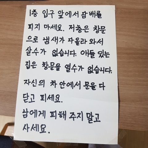 아파트 동 입구에서 남자들이 계속 담배를 핍니다. 저층에는 담배