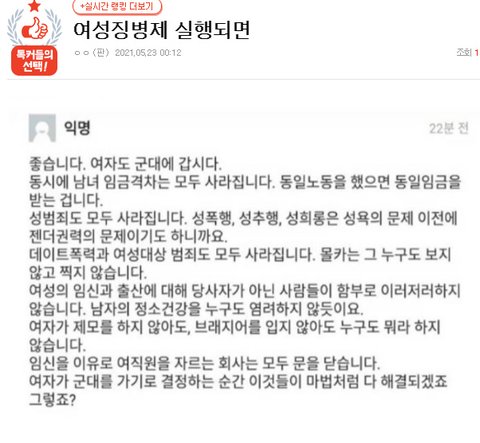 여성징병제 자체를 하면 저렇게 해줘라하는 내용도 너무 말도안되는데
