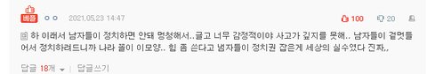 게다가 남자들은 정치를하면안되라는 저댓글 ㅋㅋ 이분법으로 나누는 저 사상
