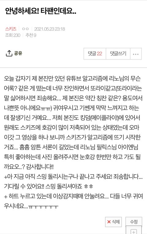 안녕하세여... 염치없이 또 왔숩니다! 죽지도 않고 왔어요... (제 본진은 비투비입니당...) 본론부터 말할게여 필릭스님 리노님 아이엔님 사진 더 받구싶어요!! 사랑합니다 짱태이 짱짱맨!! 근데 진짜 조회수 장난 아니시더라구요... 대단해요...1400만이라니... 아니 이게 아니고 사진 주시면 사랑해요!!