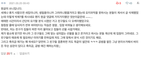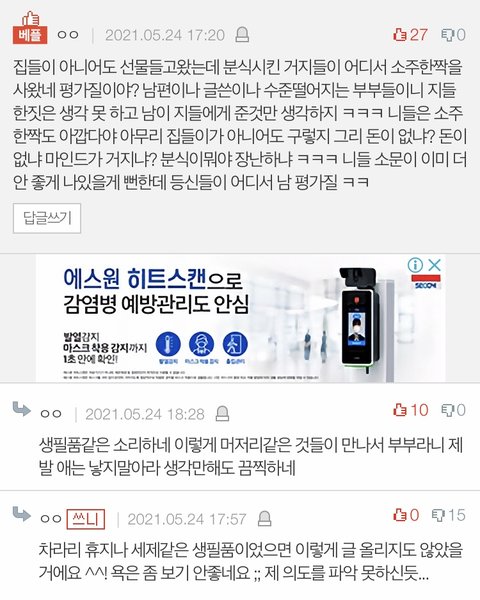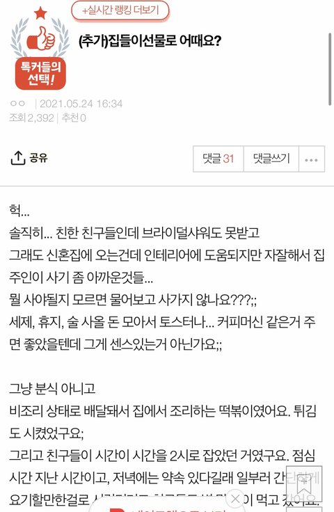 ->????? 추가글에 ‘세제, 휴지, 술 사올 돈 모아서 토스터기나 커피머신 같은거 주면 좋았을텐데’ ‘그게 센스있는거 아닌가요;;’ 타령을 함 .