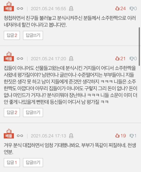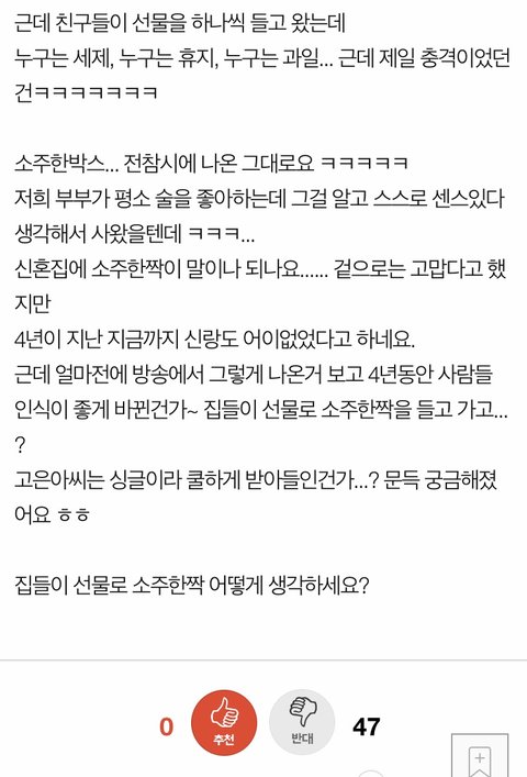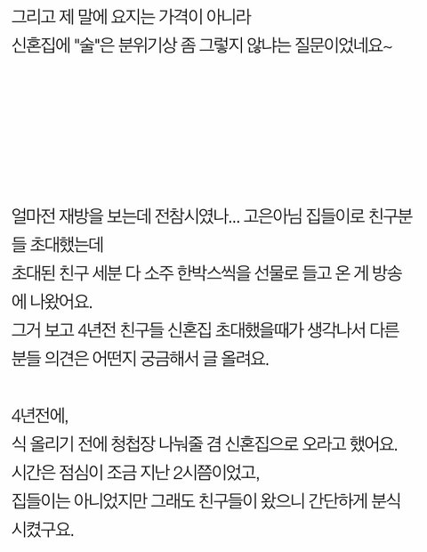 친구들 불러모아 청첩장 주면서 배달 떡볶이 끓이고 튀김 추가한 자기는 정성 들인거고, 이것저것 사들고 오면서 술 좋아하는 부부 소주 한짝 사다준 친구들은 센스 없는거고??? 와.. 할말을 잃음 ㅇㅇ