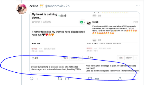 안녕 티니들~~나는 저기 옆동네에서 온 티니에요3차 2라 순위 스포 돌고나서 외티니들 분위기 안좋다고어떤 티니 한명이 국내 커뮤 반응들 (으쌰으쌰하고 격려하는 내용)을 제보했나방