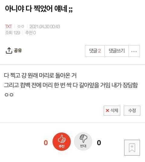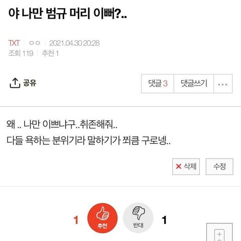 너네 다들 범규 머리 저게 뭐냐고 욕할 때 나만 내새끼 머리 이뻐 죽겠고..