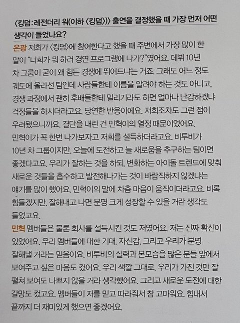 민혁 : 우려의 시선도 많았죠. 어떻게 모르겠습니까. 근데 저는 그걸 다 뒤바꿔놓을 확신이 있었어요. 왜냐면 제가 우리 멤버들에 대한 자신감이 정말 많아요. 저는 저보다도 우리 은광, 창섭, 프니엘에 대한 애정과 자신감이 크고 얘네 잘하는 거 제가 제일 잘 알게 때문에. 초반에는 멤버들조차 (출연을) 반대했고, 쉬운 과정은 아니었지만 한 명 한 명 얘기하고 설득했어요. 근데 저는 진짜 제가 정말 사랑하고 자랑스러운 우리 멤버들을 세상에 알리고 싶은 마음이 컸고 확신이 있었어요. 킹덤하면서 세상 사람들한테 우리 은광이에요 우리 창섭이에요 우리 프니엘이에요 하고 알아주는 걸 보면 내가 너무 행복해요 진짜. 물론 저도 제가 이민혁입니다! 하는 것도 마찬가지고ㅎㅎ 너무 행복해요 -210522인스타라이브