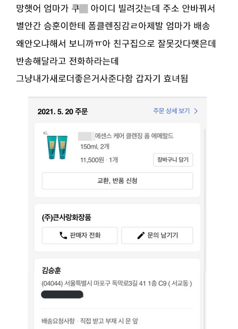 주소 안바꾸는 바람에 자기한테 물건이 오게됐다는 얘기 블라블라