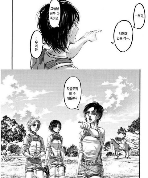 에렌에게 바다는 그저 넘어야 할 산 중 하나였던 것 같음. 분명 어릴 때는 아르민의 말을 들으며 자신 또한 바다를 희망으로 삼았지만, 이제는 최종병기로 쓰이며 인류를 구원해야 하는 막대한 부담감을 지니게 된 에렌은 더더욱 자유를 갈망하고 그저 이 전투가 끝나기만을 빌었던 것 같음. 그런 에렌에게 바다 따위보다는 바다 너머의 또다른 적과 끝없는 전투에 대한 지침이 더 크게 다가왔을 듯