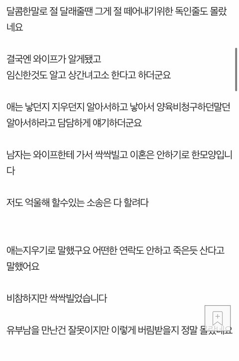나 일하던 곳 차장이 난임부부였는데 바람 피우던 상간녀 사이에서 아이가 생김. 차장은 기다리던 아이니까 와이프한테 이혼요구 했으나 와이프가 이혼 안 해줌. 그 사이 상간녀 배 불러오고 상간녀, 차장, 와이프 세집 부모가 알게 되면서 쑥대밭됨. 차장은 유책배우자니까 이혼소송도 못하고 와이프는 상간녀소송도 안 하고 있었음. 아무런 결론도 없이 상간녀 출산했음. 차장은 아에 상간녀랑 살림 합쳐서 살았음. 1년 지났나?? 차장이 지 아들 돌잔치 한다고 밥 먹으러 오라고 하는데 미친줄 알았음. 하지만 우린 부하직원이고 인사고과가 달려있어서 그냥 밥이나 먹자~ 하고 갔음. 돌잔치 끝나가는데 갑자기 비명소리 들림. 상간녀가 아이가 없어졌다고 소리 치고 차장이랑 차장부모도 귀한 손주 찾는다고 난리. 토요일에 돌잔치였는데 일요일에 무슨 일이 생겼는지 차장 월요일부터 휴가냈음. 일주일 지났나?? 차장 완전 초췌해졌고 눈 촛점도 없이 출근. 자꾸 일에 실수하고 넋 놓고 부장님이랑 이사님 눈치 주시고 정신 차리라고 욕먹음. 결국 차장 그 달에 퇴사했고 차장이랑 담배피던 동기가 우리한테 말 해줌. 돌잔치날 와이프가 상간녀 아이 데리고 집으로 와서 아이 목졸라 죽이고 본인은 손목 잘라서 자살했다 했음. 갑자기 와이프가 연락이 안되니까 차장이 오랜만에 그 집 쫒아 갔는데 욕조에서 애랑 와이프랑 죽어있는거 발견했고 바로 병원으로 옮겼는데 이미 죽은지 시간이 오래됐다면서 사망선고 했다더라. 그래서 월요일부터 휴가내서 아이 장례 치르고 와이프 장례치르고 세집이 완전 쑥대밭. 한순간에 와이프 아이 모두 잃었으니 일이 될수가 없지. 거짓말 같겠지만 실제 있었던 일이고 회사에서는 쉬쉬 하는 분위기였지만 알만한 사람은 다 알고 있는 이야기임.