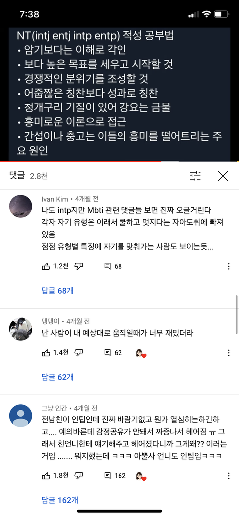 유튜브에 intp 특징 담아놓은 영상 댓글 ㄲ