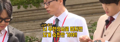 "너 무한상사로 따지면 되게 승진한거야!!" 라고 말하는 유재석
