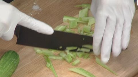 냉면 위에 올릴 오이 조지기