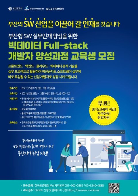 부산시 주민등록 청년을 대상으로 빅데이터 SW 개발자로 성장하고자 하는 우수학생을 선발하여 6개월 간 무료 교육 및 부산지역 유망기업 취업연계를 지원하는 [2021년 부산형 SW 실무인력 양성사업] 참여 교육생 모집을 공고 하오니 많은 참여 바랍니다.