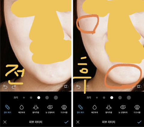 먼저 전후 바로 보여줄겡. 볼 턱 여드름, 요철같은거 싹 없애고..3살때부터 함께한 목주름 없애주고 얼굴형 피부 자동으로 우선 다 싹 보정해봤어