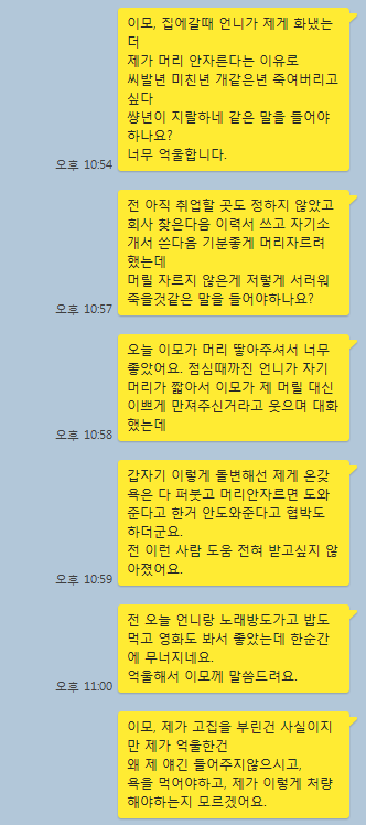 그당시 내 머리카락이 허리까지 닿는 긴 머리였어.난 긴 생머리를 좋아해서 길렀던 거였지.그 날 언니랑 외출했다 할머니네에 돌아와서 앉아있는데할머니가 내 머리가 너무 길다며 자르면 좋겠대.언니도 맞다고, 너무 길다고 거들더라고. 근데 난 싫다고 얘기했어. 그냥 얘기한 것도 아니고나는 머리카락이 긴 게 좋다. 내 취향이라 기른 거다. 라고 이유를 확실히 얘기했지.근데 언니가 갑자기 시비를 거는 거야.너 그렇게 머리 길어서 산발하고 다니면 면접 때 어떻게 할래?그래서 난 아직 이력서도 안넣었고 면접이 필요하다면 그 때 자르겠다. 아직은 졸업도 안했으니조금 더 길러보고 싶다. 라고 얘기했어.근데 갑자기 언니가 분조장이 터졌는지 자꾸 시부렁대면서 비꼬는거야.계속 위와 같은 얘길 반복했어.머릴 자르지 않으면 취업 안도와주겠다고까지 협박했지.