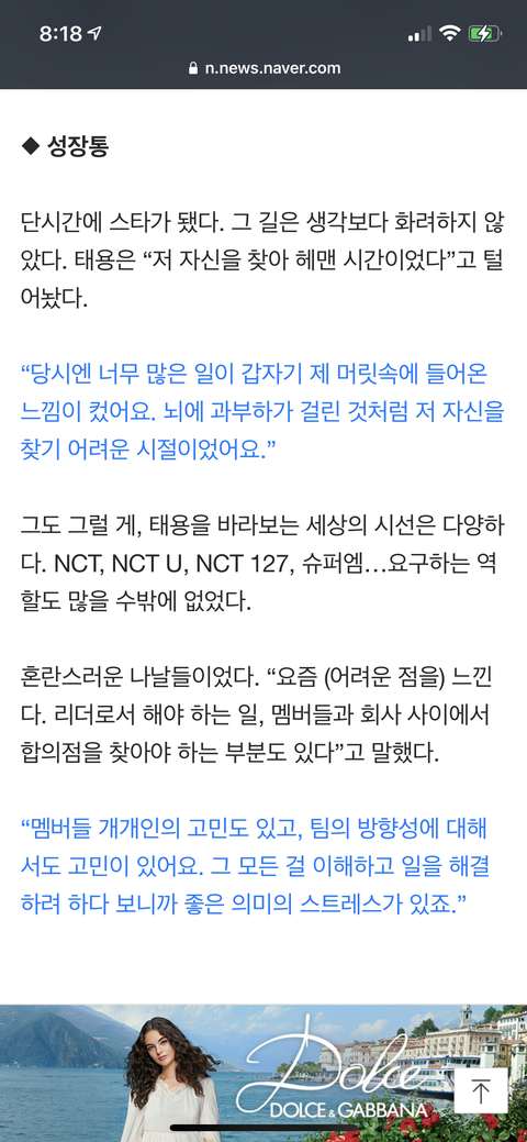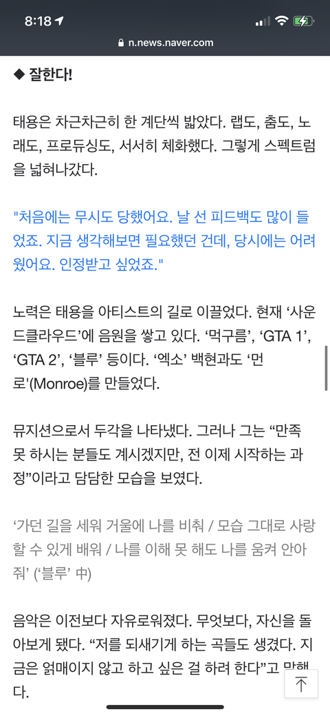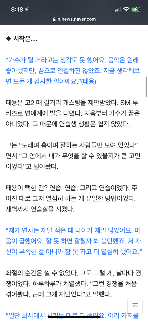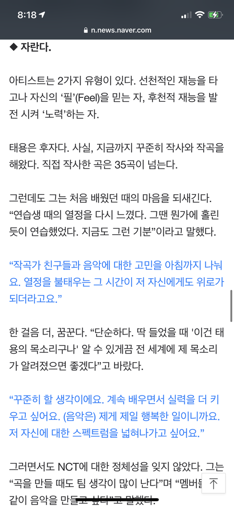 제목부터 센스에 기사 내용도 잘쓴듯..태용이 항상 자기 재능 얘기 안하고 그냥 열심히라고 하는데 콕 찝어서 재능을 발전시켜 라고 해줌ㅋㅋㅋㅋㅋㅋ