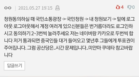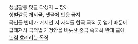 3. 마지막으로 여기 여론몰이 댓글 달 조선족, 댓글알바들아 여기다 댓글 달면 너네도 국적법, 차이나 타운 건설 반대에 참여 하는 걸로 알고 너희 천안문 민주화 운동에 참여 하는 걸로 간주할게! 아 얘들아 이런 글 올린다고 한남이니 일베니 페미니 이런거 다 함정이야 믿지말고 안좋은 눈으로 보지도 마. 이거 다 너네가 태어나고 자란 땅에서 벌어지는 일이고 너희가 관심을 안가지면 우리의 자유도 없어 제발 독립운동가분들을 생각해봐!! 난 너희가 제발 깨어났으면 좋겠다.