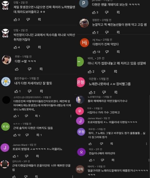 이게 니들이 말하는 비판이야? 노래 못한다는 이유로 저런 욕을 들어야 하는거야? 잔인해서 말이 안나온다 진짜 너무 심한거 아니냐;; 심지어 저 영상에서 다현 노래 부름 근데 마이크 문제 때문에 잘 안들린거 뿐임… 트로피도 바로 바닥에 내려놓고 앵콜함… 진짜 왜 그러냐 이러다 또 누구 죽으면 입 싹닫을거면서… 난 당사자도 아닌다 조카 정신병 걸릴 것 같음 아무리 연예인이 관심으로 먹고사는 직업이라 해도 이건 아니지; 뇌절 작작좀 해 진짜 그리고 니들 잘하는 영상엔 관심도 없잖아