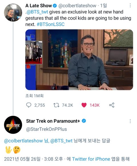 정국이 미국방송에서 스타트랙에나온 제스처함-스타트랙출연배우가언급