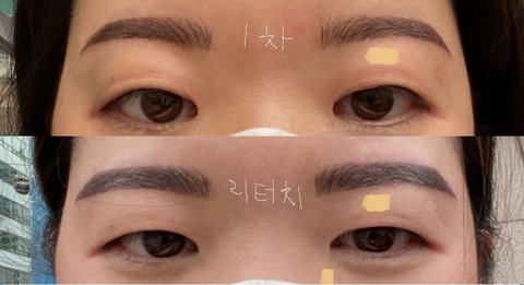 1차 때 눈썹 디자인 전반적으로 마음에 들었구요. 다만 굵기만 전체적으로 조금 얇은 듯 하여 이 디자인을 토대로 굵기만 매우 조금 두껍게 해달라고 어제 리터치 때 요청드렸습니다.제 요청을 충분히 알아들으신 듯 하고 밑그림 그려서 거울로 보여주시긴 했습니다.특히 1차 때 눈썹 가장 높은 산? 부분을 각지지 않게 둥글고 자연스럽게 처리해달라고 해서 밑그림은 각져 보여도 알아서 해드리겠다 하셨고, 정말 제가 원하던 그낌으로 자연스런 둥글진 꺽임으로 해주셔서 만족했었구요.어제 리터치때도 밑그림에서 산이 각져 보였지만 1차 때 처럼 어련히 알아서 해주시겠지 싶어 말씀 안드렸습니다. 시술 직전 1차 때 제 사진을 분명 한 번쯤은 체크하셨을 테고 또 현재 남은 잔흔만 봐도 파악되셨을 거구요.(1차 때 디자인 거의 안 지워져서 잘 보여요, 평소 눈썹 메이컵은 아예 안하고 다닐 정도로 짙게 잘 남아있었어요)