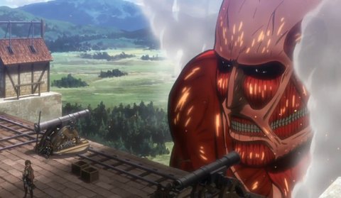 그리고 그 순간 폭발적인 굉음과 함께 5년 전 그때처럼 초대형 거인이 벽 위로 얼굴을 내밀고 나타남.
