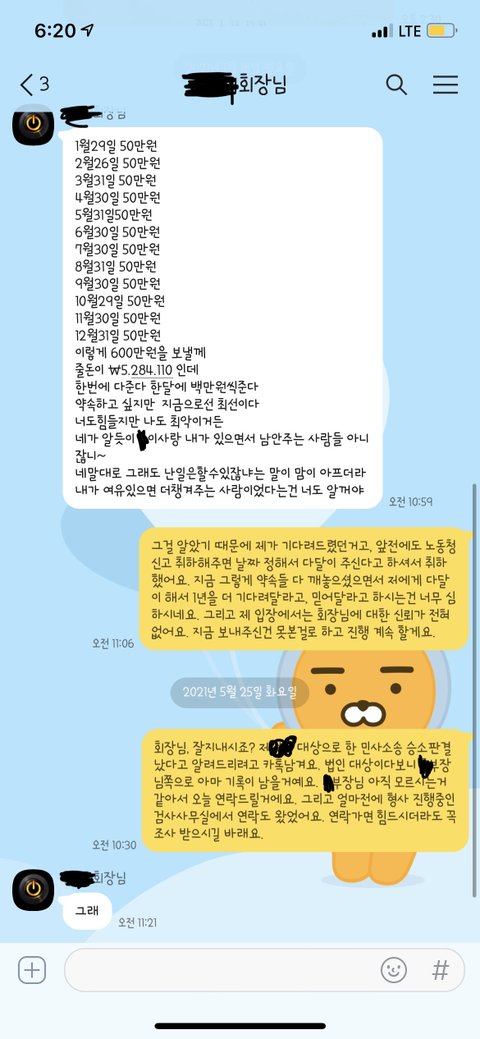 그래서 형사소송을 진행을 기다리고 있는데 몇달전 저에게 전화가 왔습니다. 본인이 지금 제주도에 아는 사람 집에서 총무이사와 함께 살며 ㅇㅅㄹ김밥에서 일한다고, 일하는것도 힘들고 본인이 조사때문에 자리를 비우면 총무이사였던 동생이 오늘 다쳤는데 또 다친다고(ㅋㅋㅋㅋ 다시 생각해도 어이가 없어서 잠시 웃을게요) 무튼 그러길래 내가 언제까지 사정을 봐줘야되냐고 이만큼 봐줬으면 내사정을 이제 그쪽에서 봐주셔야 될때 아니냐고 했습니다. 그러면서 다달이 얼마씩 지급해준다고 카톡이 왔습니다. 못본척하고 진행한다고 했습니다. 그리고 그 이후 연락 일체 없었고 제가 그저께 민사 승소확정났다고 알고 있으라고 서류상법인대표랑 대표에게 카톡을 하니 그래. 이렇게만 톡이 왔습니다.