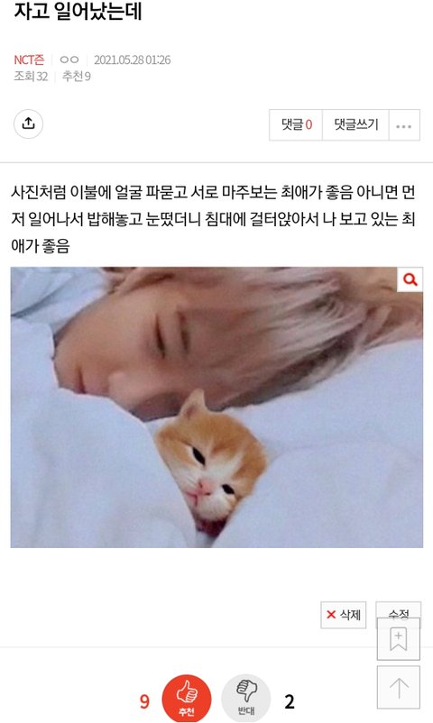 아침에 비몽사몽 한이불에서 일어나고 싶은 사람 누구로 상상했는지 해명해라