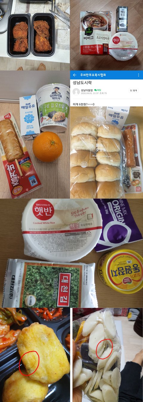 까맣게 타버린 생선까스, 머리카락이 들어간 튀김과 떡국 떡......햇반과 김 참치로 영양소가 골고루 갖춘 도시락....
