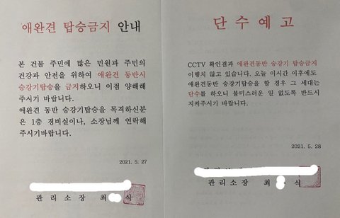 'CCTV 확인결과 애완견동반 승강기탑승금지를 이행치 않고 있습니다. 오늘 이시간 이후에도 애완견동반 승강기탑승을 할 경우 그 세대는 단수를 하오니 불미스러운 일 없도록 반드시 지켜주시기 바랍니다. 2021.05.28'