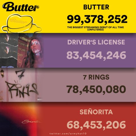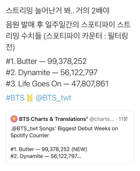 스포티파이 역사상 발매 첫 주 스트리밍 최고기록으로 1등이래! 다마 거의 2배네ㄹㅇ