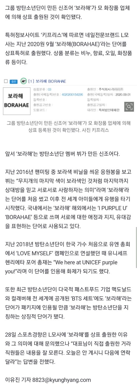 방탄 '보라해' 모 업체가 상표출원했다는데??????