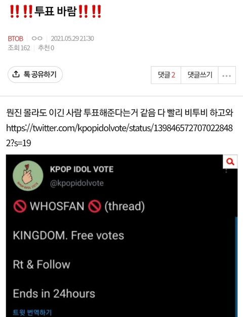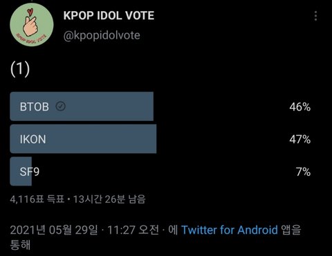 아까 이 글 썼는데 지금 비슷함ㅠㅠㅠ 우리 짹 계정 많잖아 그거 다 투표하자 https://twitter.com/kpopidolvote/status/1398465727070228482?s=19