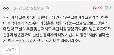 와 근데 맞아 지금 엑소엘들 보면 대학생되고 직장인된 에리들 많을걸? 아미분들도 보면 찐아미분들은 학창시절에 아미되서 대학생된분들도 직장인분들도 많음ㅜㅜ엑소 방탄은 딱 학창시절때의 추억이 생각나서 뭔가 기분이 묘함 엔시티는 시즈니분들이 지금 중 고등학생분들 대학생 이렇게 있을텐데ㅠㅠ 모르겠다 그냥 다 내 학창시절을 보냈던 그룹은 엑소 방탄 지금 내 20대 청춘을 같이 보낼 그룹은 엔시티 같음
