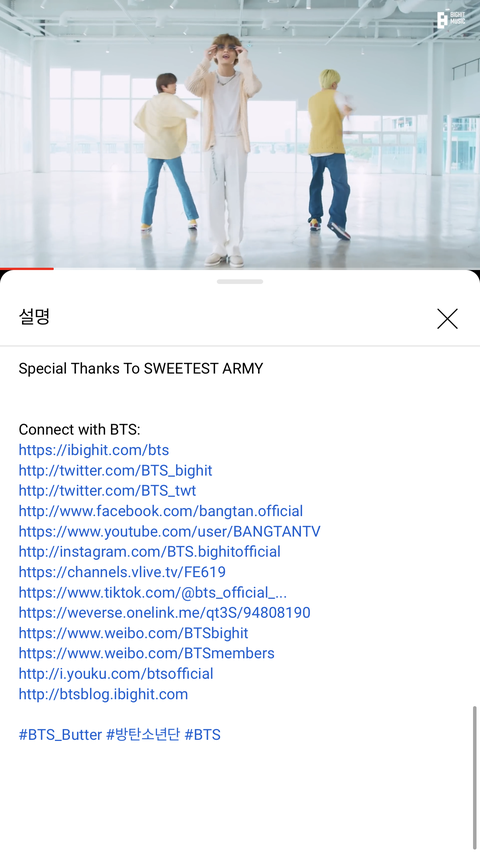 이거 방금 올라온 버터 영상에 있는 설명인데 special thanks to sweetest ARMY 래ㅠㅠㅠ