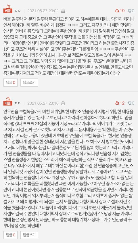 유지민 데뷔 무산되면 좋겠음 - 케이돌토크 카테고리제가 캡쳐를 조작하지 않았다는 증거로 9월 30일 '더쿠' 글 링크를 하나 올려두겠습니다. SM연습생 갤러리에 올라왔던 것과 정확히 같은 캡쳐입니다. 구글에 검색해보셔도 같은 캡쳐사진들을 얻으실 수 있습니다.